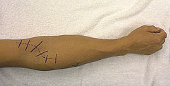 Right elbow with surgical incision outlined by marker (Hand to the right outside of picture) |