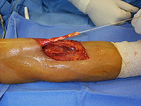 Intraoperative picture torn biceps tendon Front view (Hand to the right, outside of picture) |